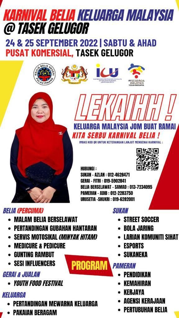 TASEK GELUGOR, PULAU PINANG, 24 & 25 SEPTEMBER 2022 - Karnival Belia Keluarga Malaysia telah berjaya dijalankan selamadua hari, bermula pada 24 sehingga 25 September 2022 yang bertempat di Pusat Komersial, Tasek Gelugor. Pengisian aktiviti dibahagikan kepada beberapa segmen antaranya belia, kesihatan, pameran kerjaya & pendidikan, sukan, gerai dan jualan serta keluarga (pertandingan mewarna keluarga dan pakaian beragam tradisional Malaysia bagi kanak-kanak).