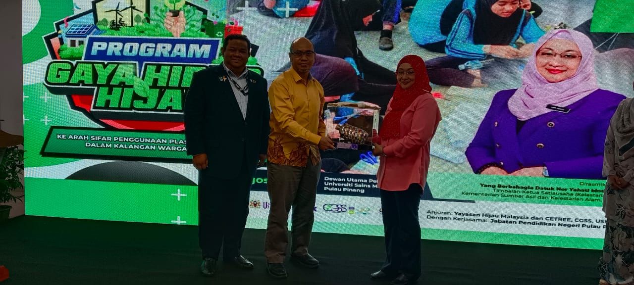 USM PULAU PINANG, 23 Ogos 2024 – Kesedaran mengenai kepentingan kelestarian alam semakin menjadi tumpuan dalam usaha memelihara alam sekitar bagi generasi akan datang. Menyedari hakikat ini, satu program kesedaran berkaitan gaya hidup hijau telah dianjurkan oleh Pusat Pendidikan dan Latihan Tenaga Boleh Baharu, Kecekapan Tenaga dan Teknologi Hijau (CETREE), CGSS, USM dengan kerjasama Yayasan Hijau Malaysia (YHM) dan Jabatan Pendidikan Negeri Pulau Pinang (JPNPP) di Universiti Sains Malaysia (USM), Pulau Pinang, pada 22 Ogos 2024. Program ini bertujuan untuk meningkatkan kesedaran dalam kalangan warga sekolah, khususnya guru dan murid sekolah menengah di negeri Pulau Pinang, mengenai kepentingan amalan lestari dalam kehidupan seharian. "Montaj Rasmi Program Gaya Hidup Hijau Peringkat Negeri Pulau Pinang tahun 2024"